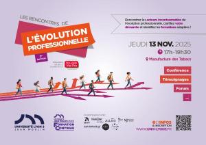 - Les rencontres de l'évolution professionnelle 202513 novembre 2025Envie de vous reconvertir ? Besoin d'évoluer dans votre vie professionnelle ? ? l’occasion de la journée nationale de la reconversion professionnelle, l’Université Jean Moulin Lyon 3 ouvre ses portes au grand public le 14 Novembre 2025 de 17h00 à 19h30.